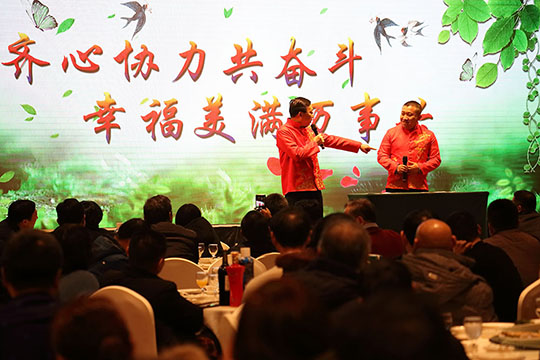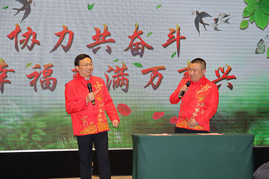 由阿彬主任、副總工阿杰自編自演的相聲《幸福三圣》,再現(xiàn)了洋溢在三圣集團(tuán)大家庭中的濃濃幸福氛圍。這篇原創(chuàng)的相聲題材,傾注了編者的智慧和用心,巧妙將2018年度三圣大事件貫穿其中,詼諧幽默,“包袱”連連,獲得滿堂喝彩,兩位相聲演員也被贊“三圣德云社”;